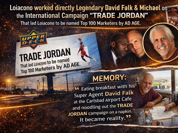 Loiacono worked directly Legendary David Falk & Michael on the International Campaign "TRADE JORDAN" that led Loiacono to be named Top 100 Marketers by AD AGE. MEMORY. The biggest memory was when David Falk said "Chicago May Trade Michael," in that moment the Billboard Campaign was born. That single sentence transformed speculation into strategy, turning Upper Deck into the center of a global conversation and marking one of the most daring breakout moments in the brand’s history.
